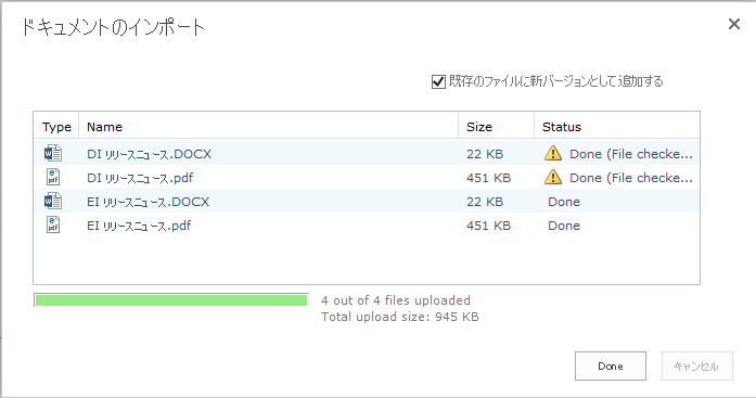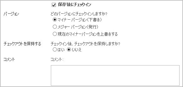 保存後にチェックイン:選択したドキュメントは保存後にチェックインされます。