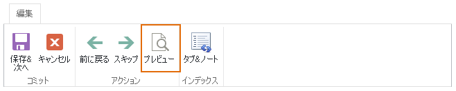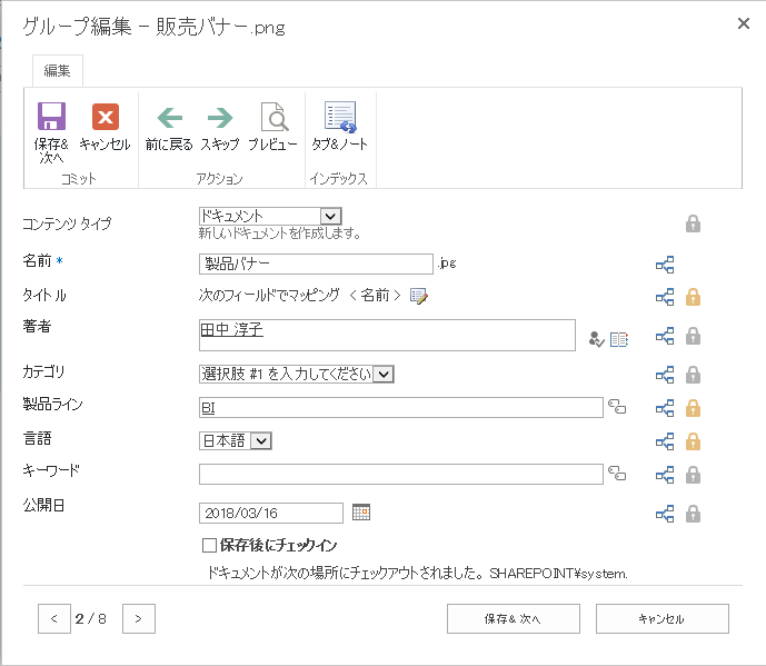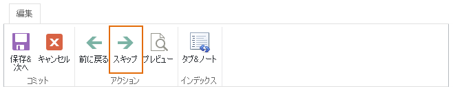 現在のドキュメントでフィールドの変更が必要ない場合は、リボンメニューの[スキップ]ボタンをクリックします。現在のドキュメントやリスト項目をスキップできます。