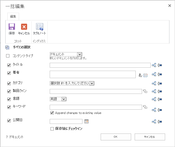 この機能を使って、複数のドキュメントやリスト項目に一括で タグおよびノートを追加できます。