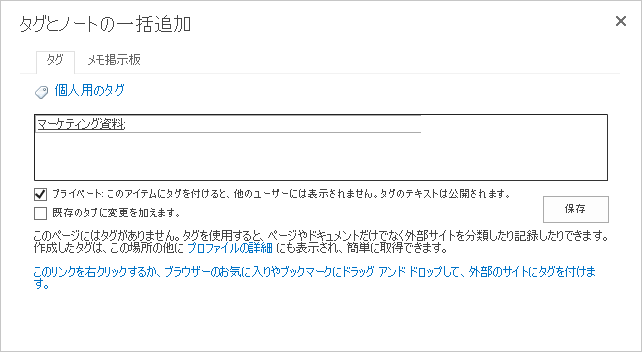 プライベート: このオプションを選択すると、他のユーザーには項目にタグが付けられたことは表示されませんが、タグテキストは公開されます。