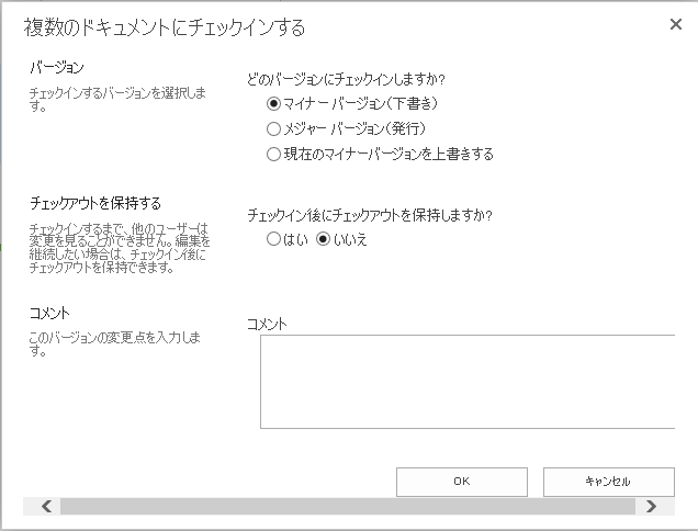 注: チェックインオプションは、現在のドキュメントライブラリのバージョン設定に影響を受けます。バージョンがバージョン設定ページで選択されていない場合、[複数のドキュメントのチェックイン]ウィンドウに、バージョン選択のオプションが表示されません。