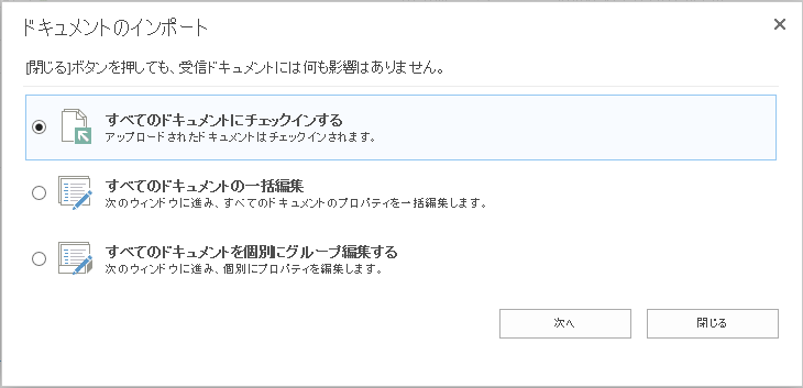 この機能は、ドキュメントライブラリで大量のドキュメントをチェックインするとき役立ちます。