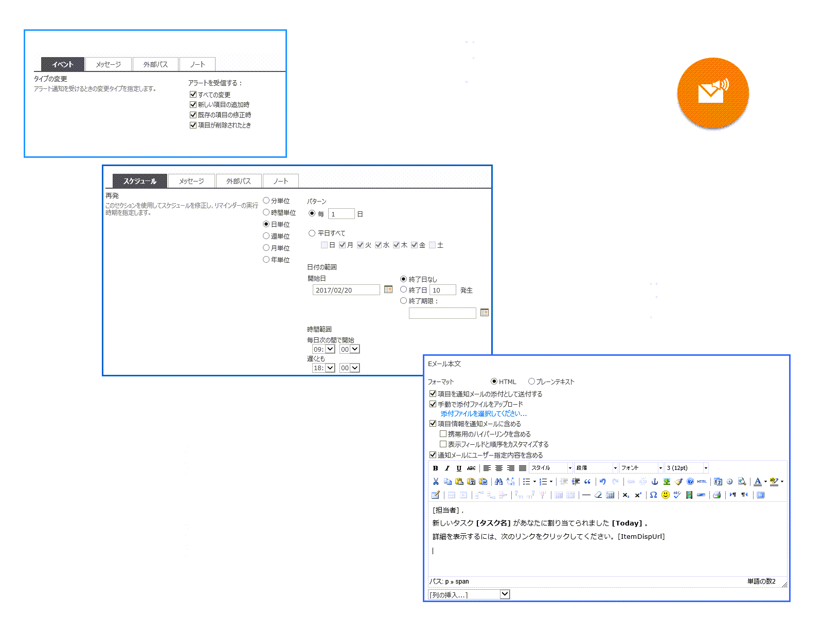 SharePointオンプレミスでアイテムやドキュメントが作成、変更、削除された場合や、今後のタスクや締切が近づいた場合にメール通知を受け取ることで、状況を常に把握できます。