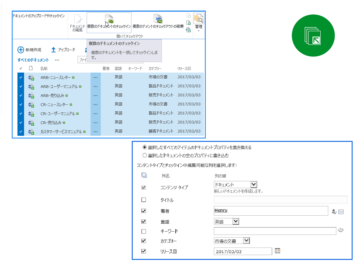 SharePointのドキュメントライブラリ内で、複数のドキュメントを一括チェックインし、フォルダー内のドキュメントを含めてプロパティをまとめて更新できます。これにより、ドキュメント管理が簡素化されます。