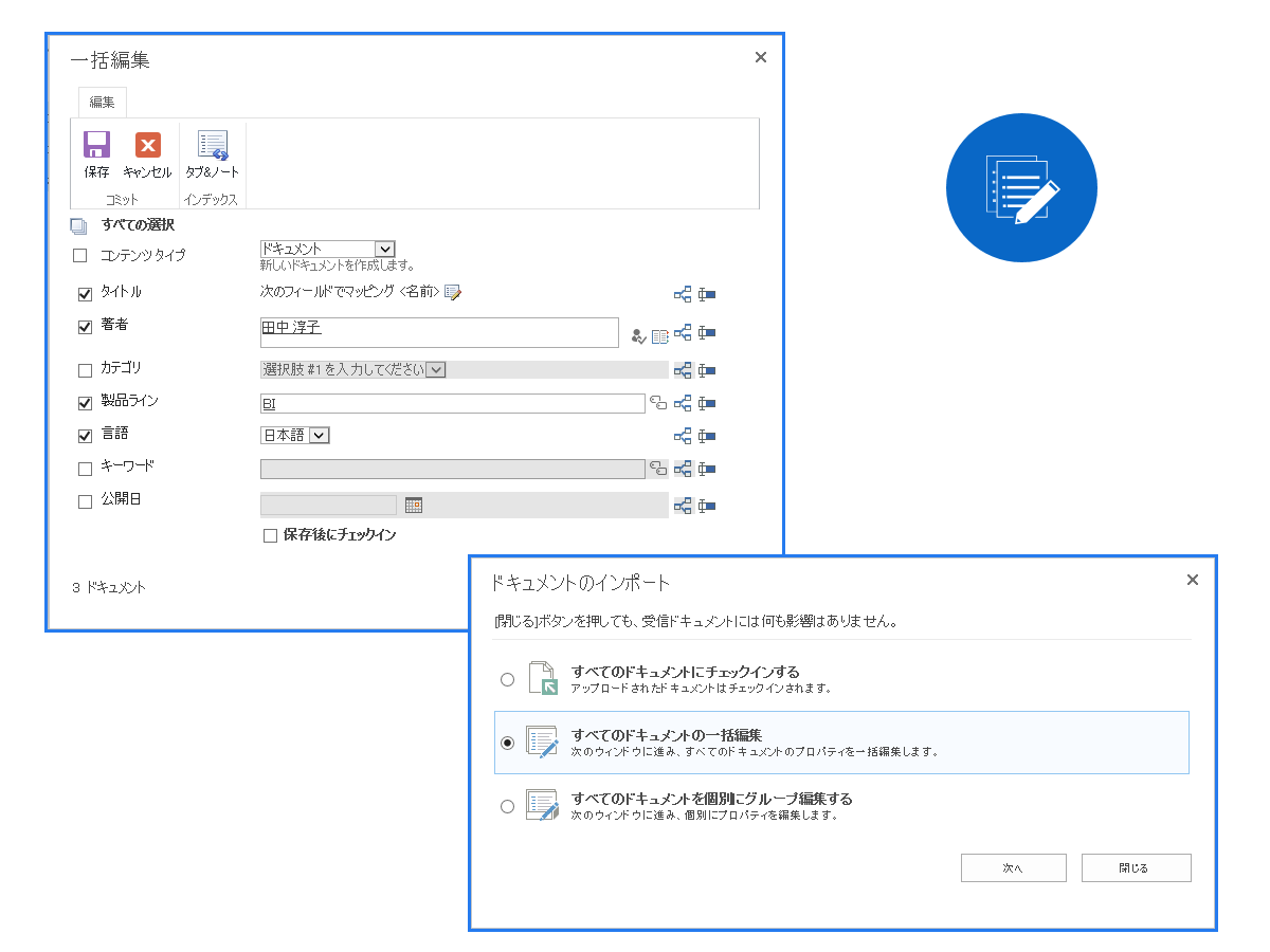 SharePointオンプレミス内で、メタデータ(プロパティ)の一括編集、チェックイン、承認または却下を一度の操作で実行できます。これにより、繰り返し作業を大幅に削減し、生産性が向上します。