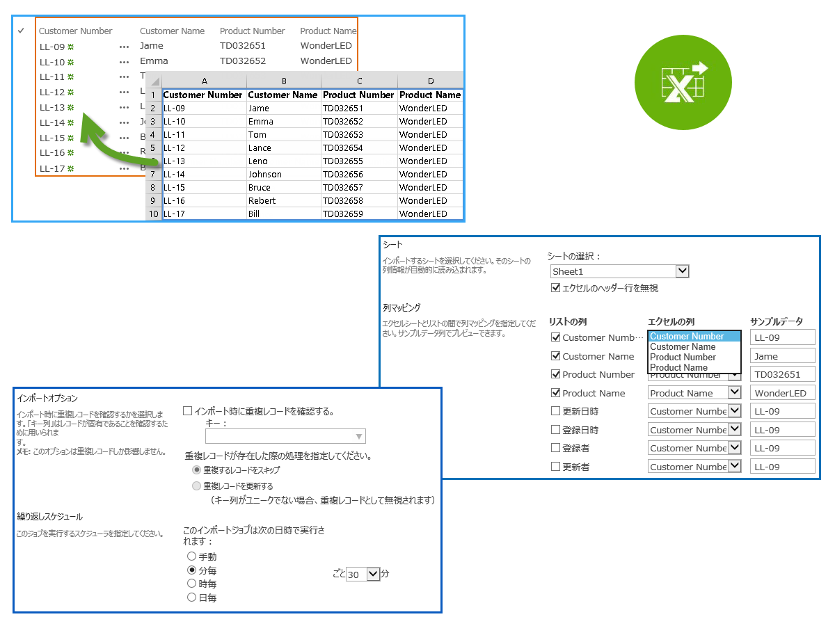 ExcelからSharePointオンプレミスのリストへ大量のデータを簡単にインポートできます。手動だけでなく、スケジュールに基づく自動インポートも可能です。列マッピング機能で、データを正確に適切な列へインポートできます。