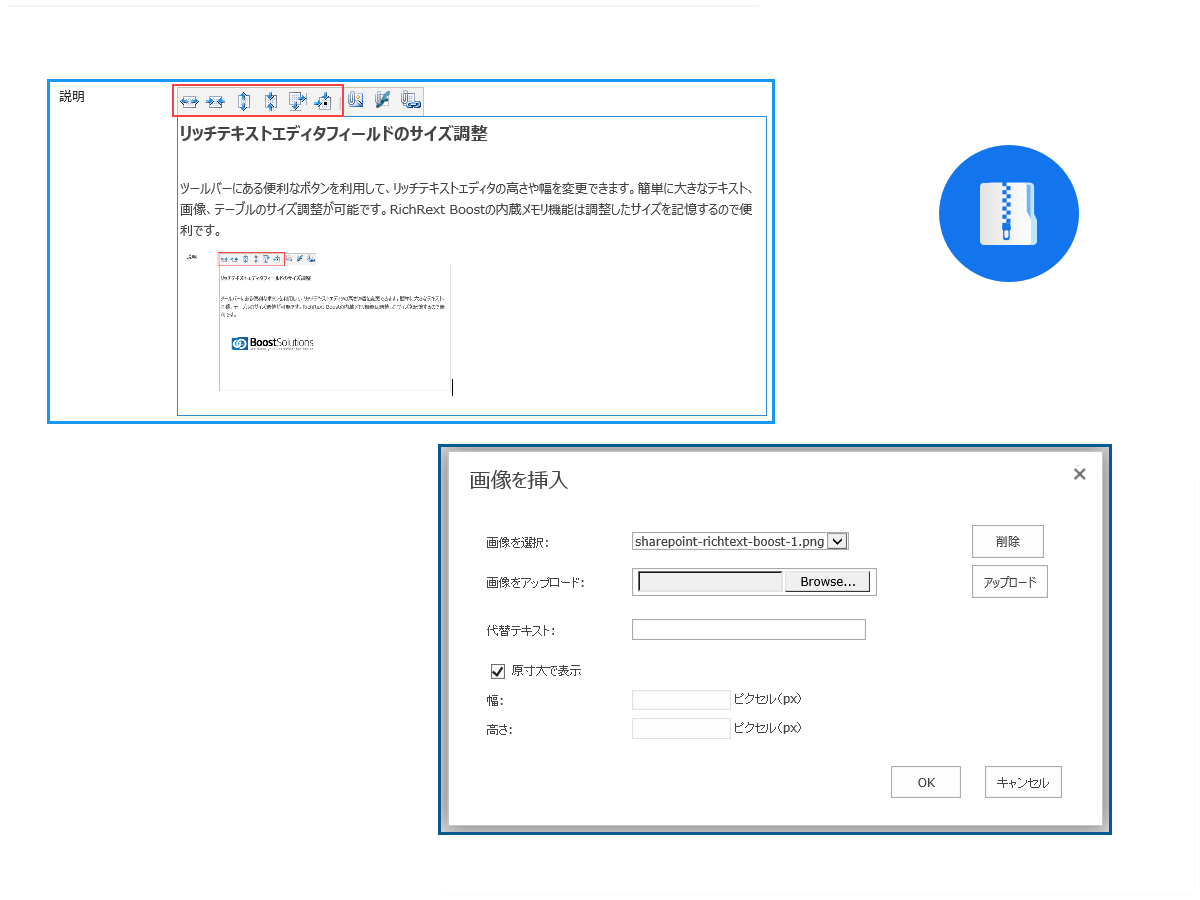 SharePoint のリッチテキスト列を拡張機能で強化しましょう。必要に応じて、テキストエディターの幅や高さなどのサイズをカスタマイズできます。エディター内で簡単に画像やファイル(アイコン付きで表示)を直接アップロードすることが可能です。