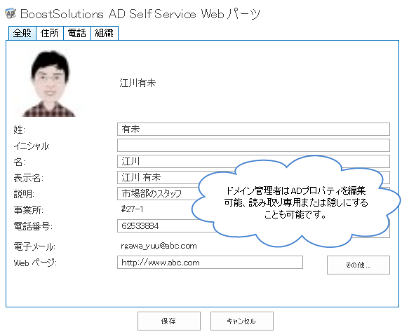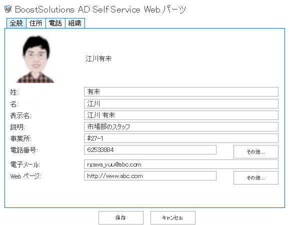 電話番号、Eメールアドレス、部署名、住所などのプロパティを簡単に変更したり、AD Self Service Webパーツの写真を更新したりできます。JPG、BMP、PNG 、GIFのファイル形式がサポートされます。