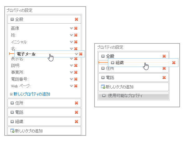 タブを使用してADプロパティをグループ化することが可能です。Webパーツのオーナーは、タブやタブに含まれるプロパティを追加、削除、編集できます。表示順序を調整するには、タブやプロパティをドロップ・アンド・ドラッグして行います。