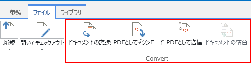PDF Converterを起動すると、さまざまな機能がドキュメントライブラリのリボンで利用可能になります。これらの機能は、[ファイル]->[変換]グループにあります。