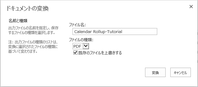c. ファイル名を指定し変換するファイルタイプを選択します。ファイルを新しいバージョンとして既存のファイルに追加するか指定します。