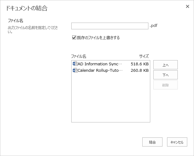 この機能によりドキュメントライブラリで複数のドキュメントやファイルを1つのPDFファイルに結合できます。