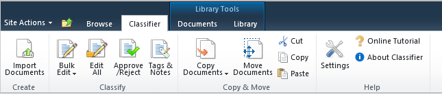 本製品では、Classifierというリボンタブがすべてのサポートされるドキュメントライブラリ/リストに追加されています。