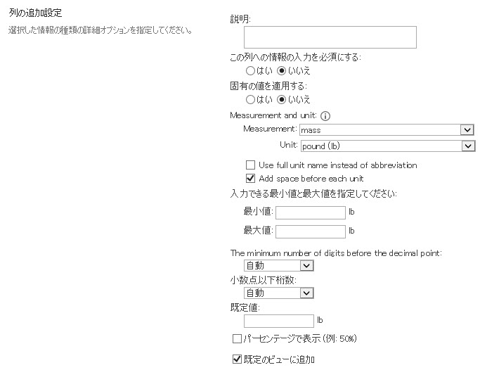 h.「列の作成」ページで、ドライバーの体重を保存するための列の名前を「体重」と入力します。情報の種類として「Measurement」を選択し、「Measurement and unit」のセクションで、「Measurement」に「mass」を、「Unit」に「pound (lb)」を選択します。表示設定で「略名ではなくフルネームを使う」を選択しない場合、ポンドはlbと表示されます。